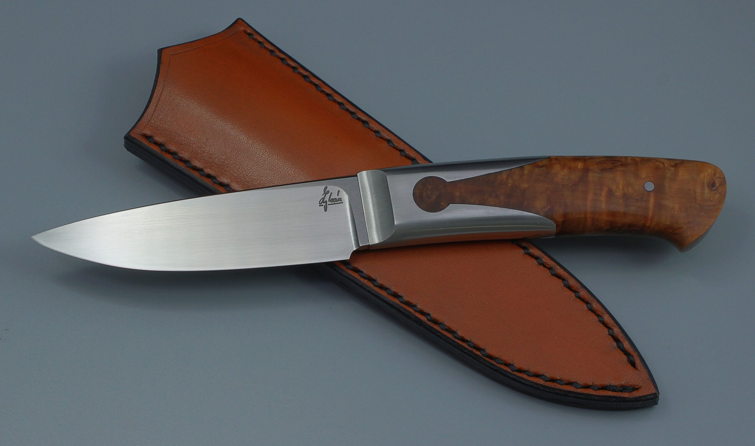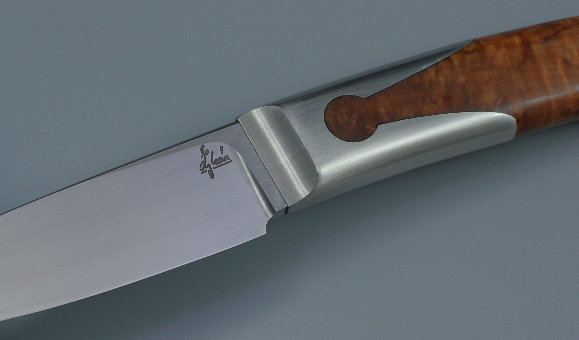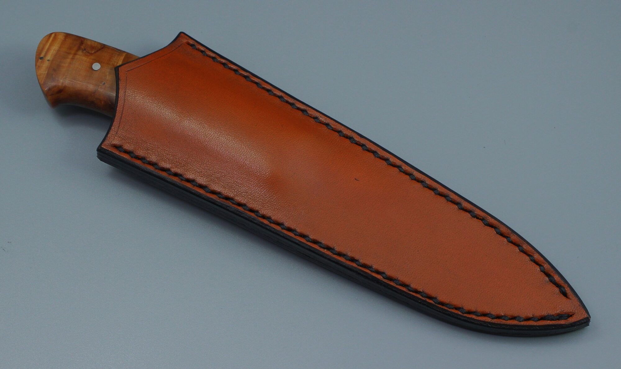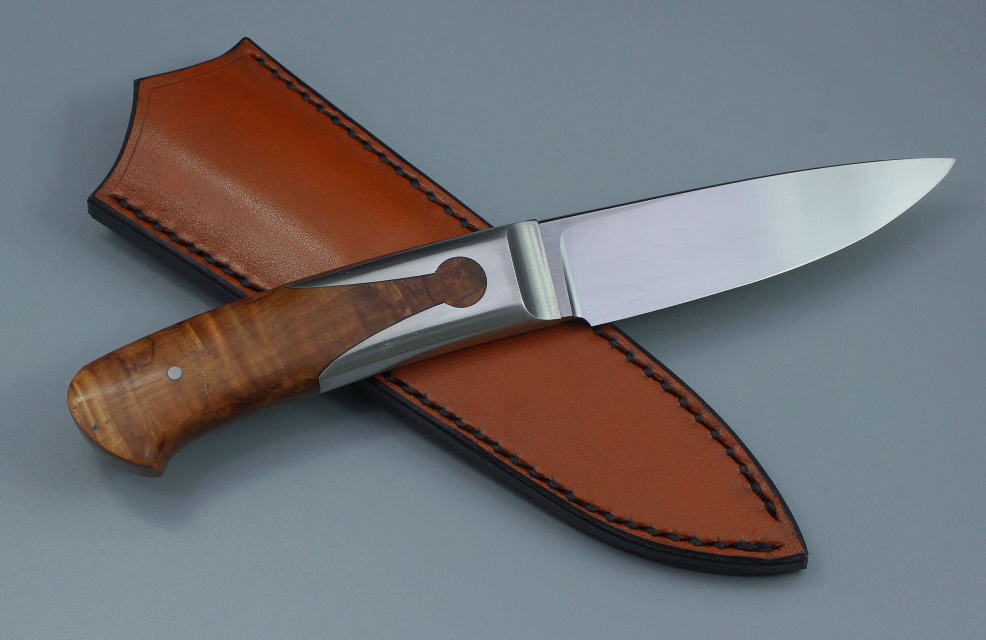I suppose it is the combination of a thin grind and a fine grain of the steel that makes these knives scary sharp. This one has 3,8mm thick blade, 10 cm long, one of the 3D printed bolsters and a stabilized birch.